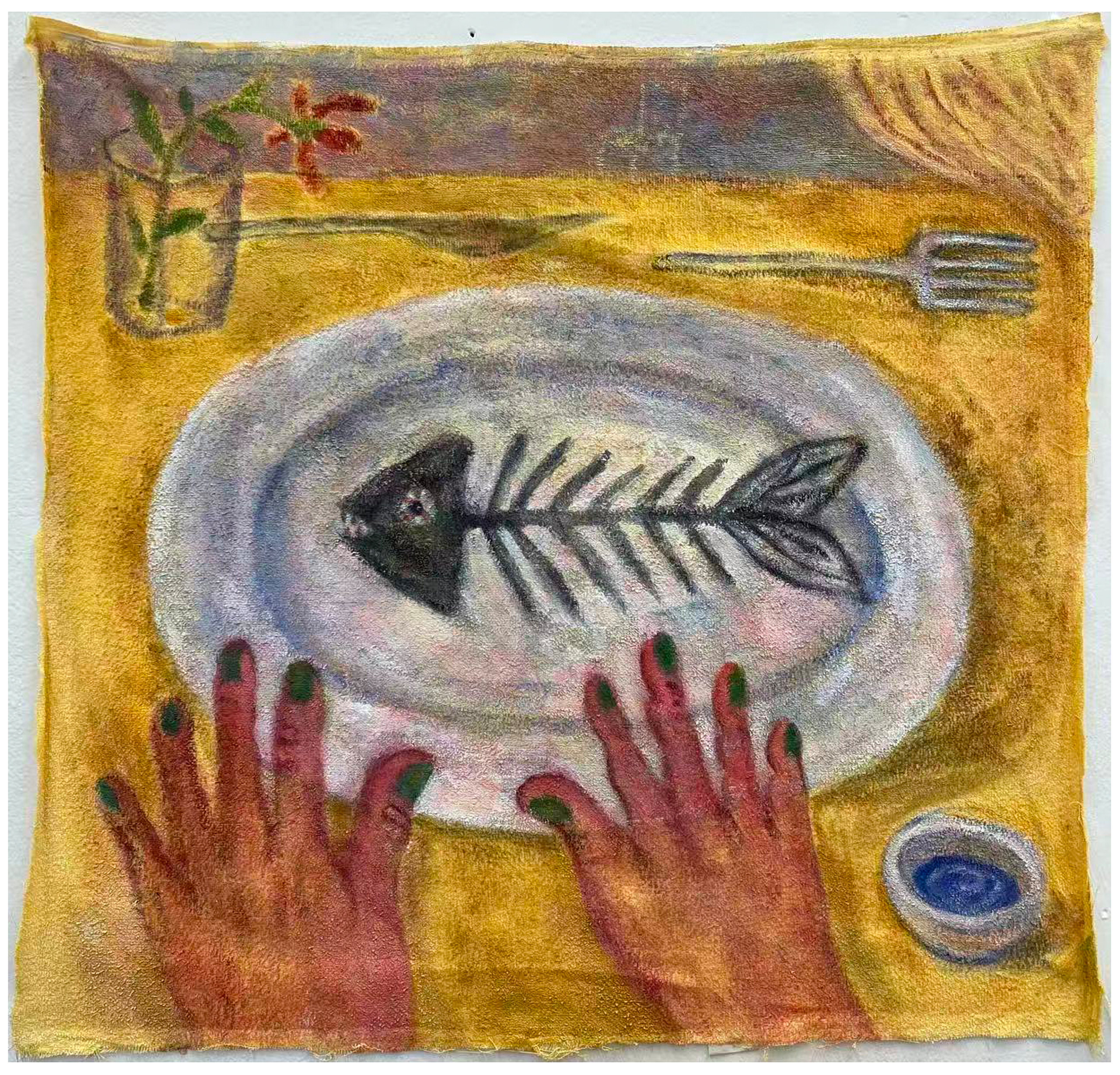 Acrylic on towel, wooden shelf